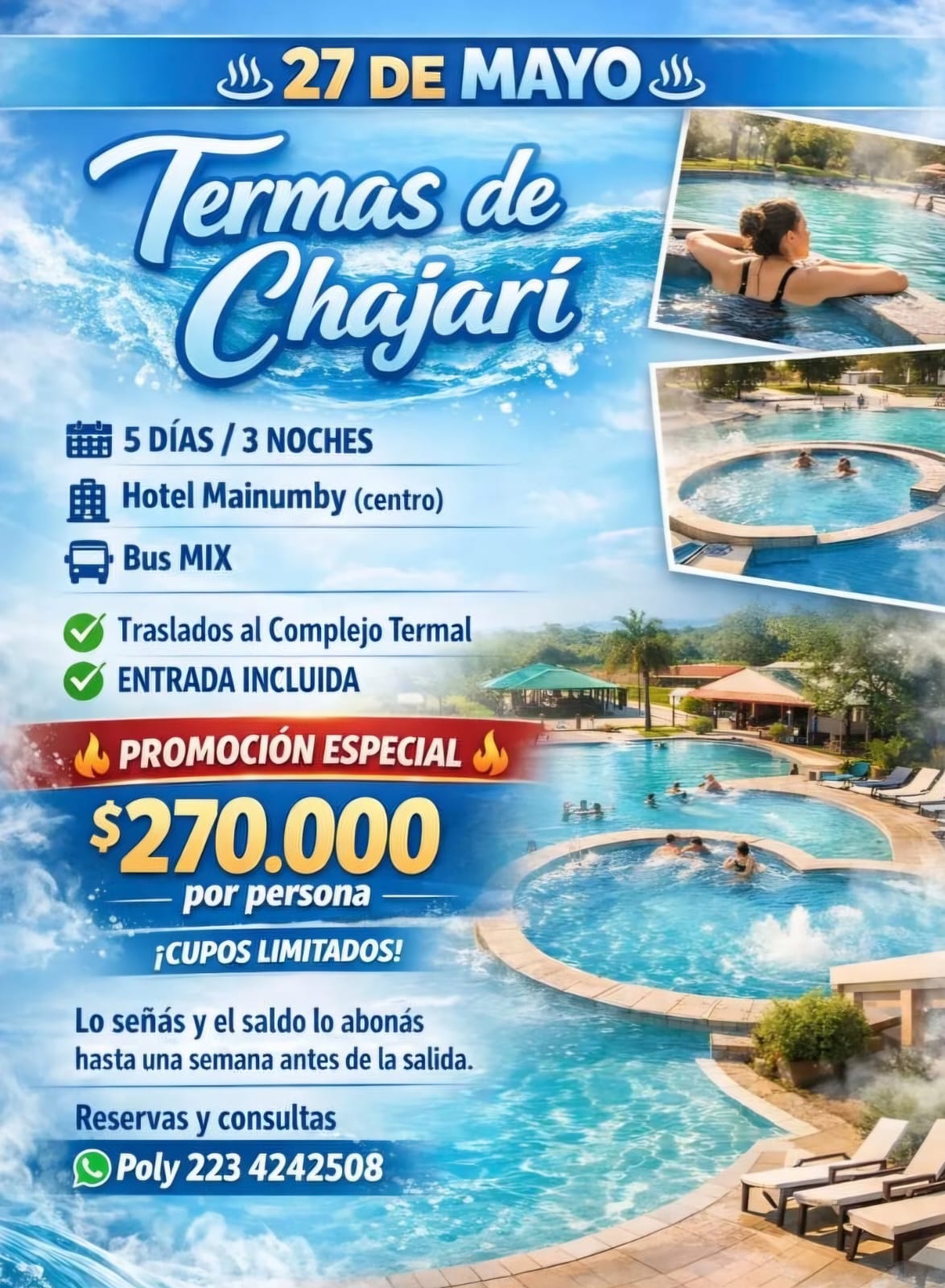 🌊♨️ 27 DE MAYO ♨️🌊Destino: Termas de Chajarí🚌 5 DÍAS / 3 NOCHES🏨 Hotel Mainumby (ubicación céntrica)🛏️ Base doble / triple🚌 Bus MIX✅ Traslados al